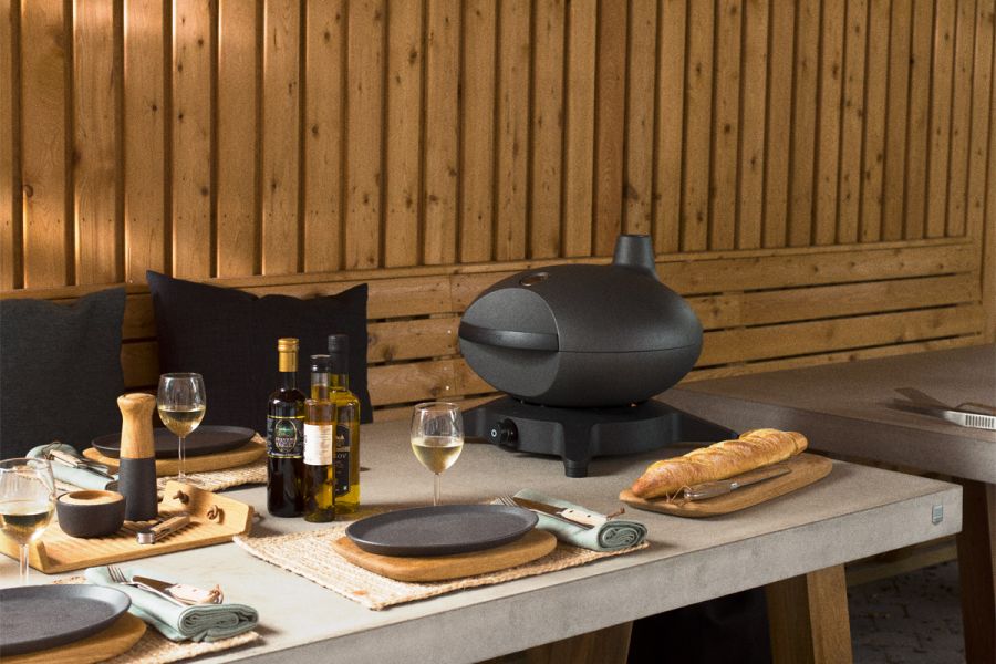 De buitenkast is gemaakt van gegoten aluminium en het grillrooster van massief gietijzer. De minimalistische handgreep maakt de voorkant van de vorm compleet, zowel qua design als ergonomie.